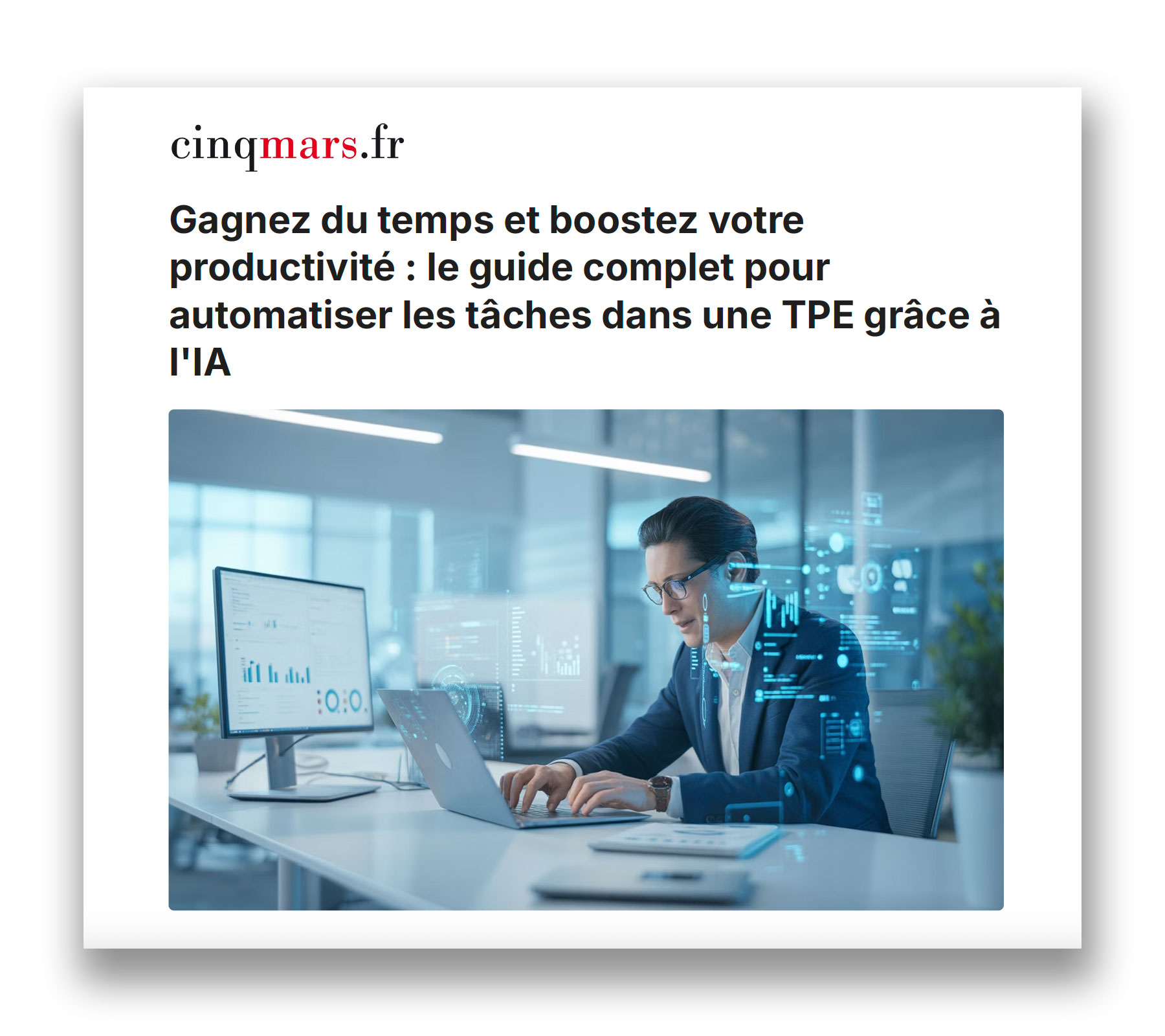 Dans ce guide complet, Cinqmars vous montre comment utiliser l’intelligence artificielle et les bons outils d’automatisation pour simplifier votre gestion, optimiser votre communication et faire croître votre activité.